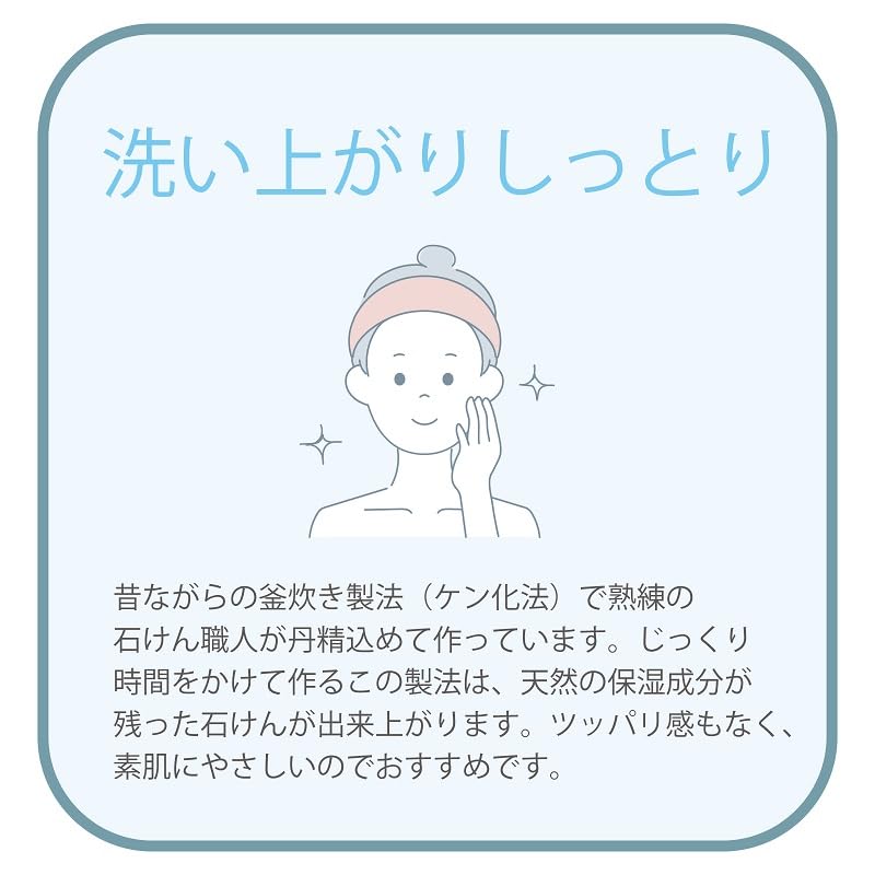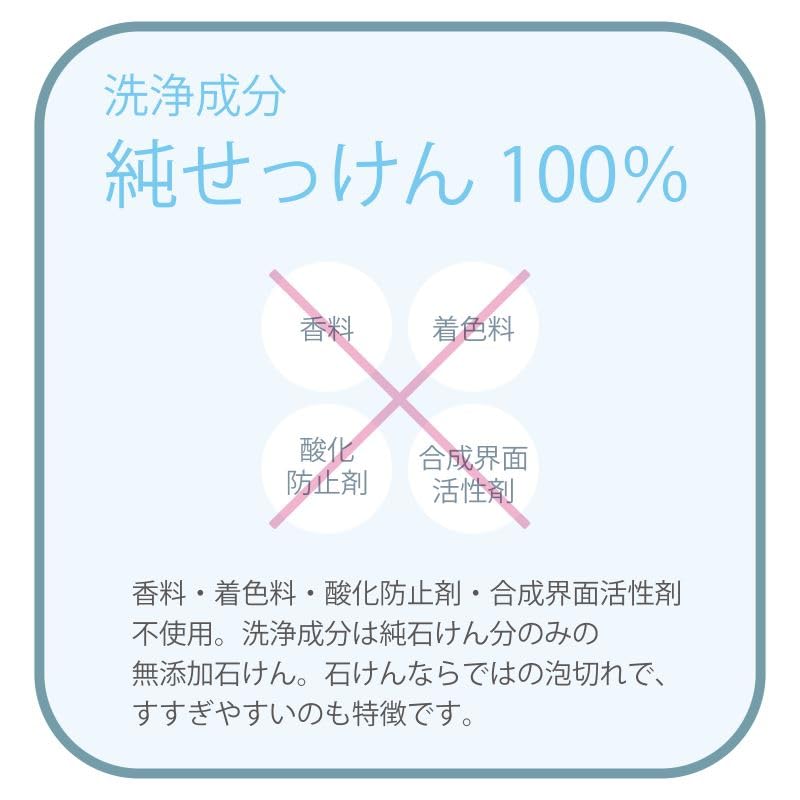 香料・着色料・酸化防止剤・合成界面活性剤 不使用。洗浄成分は純石けん分のみの 無添加石けん。石けんならではの泡切れで、 すすぎやすいのも特徴です。