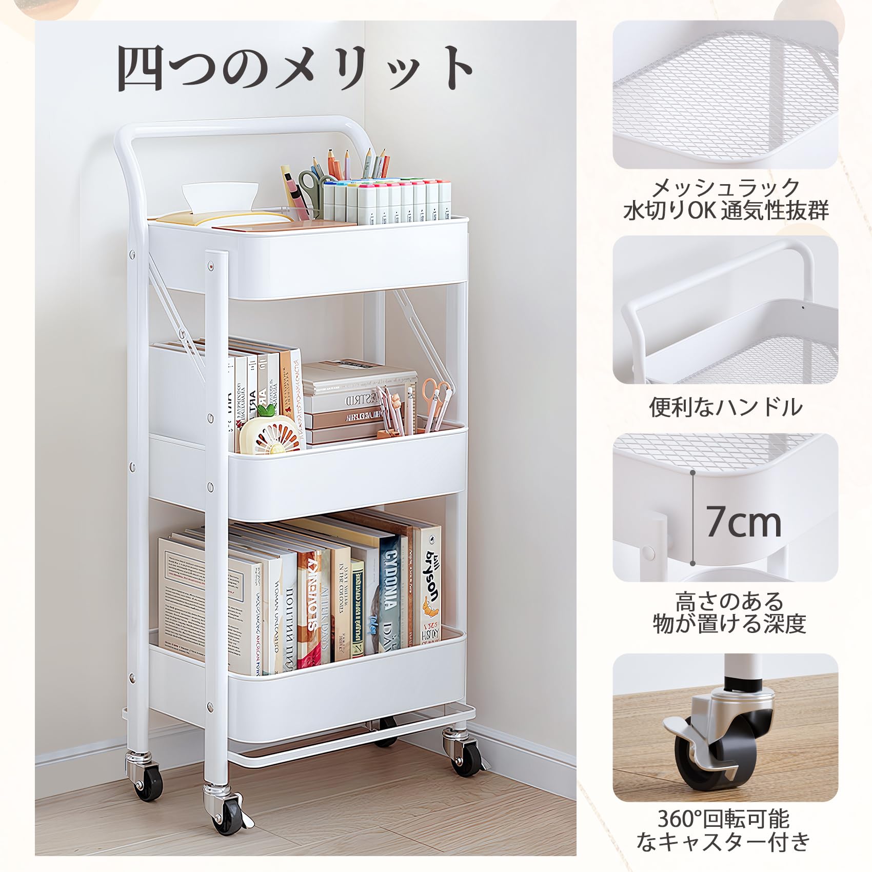 【使用便利】ハンドルとスチールキャスターで移動は非常に便利です。360°自由回転キャスターは4脚中2脚はストッパーが付いているので、使用中に不意の動きを抑制します。 お手入れも簡単です。普通の容器に溜まりやすいホコリは長時間が経てば清潔を保つことは非常に難しいです。下側には小さな穴が開いているメッシュラックが設計しました、通気性抜群で、ホコリも溜まりにくいです。湿気が多い場所・季節にも適しており、お手入れも簡単です。