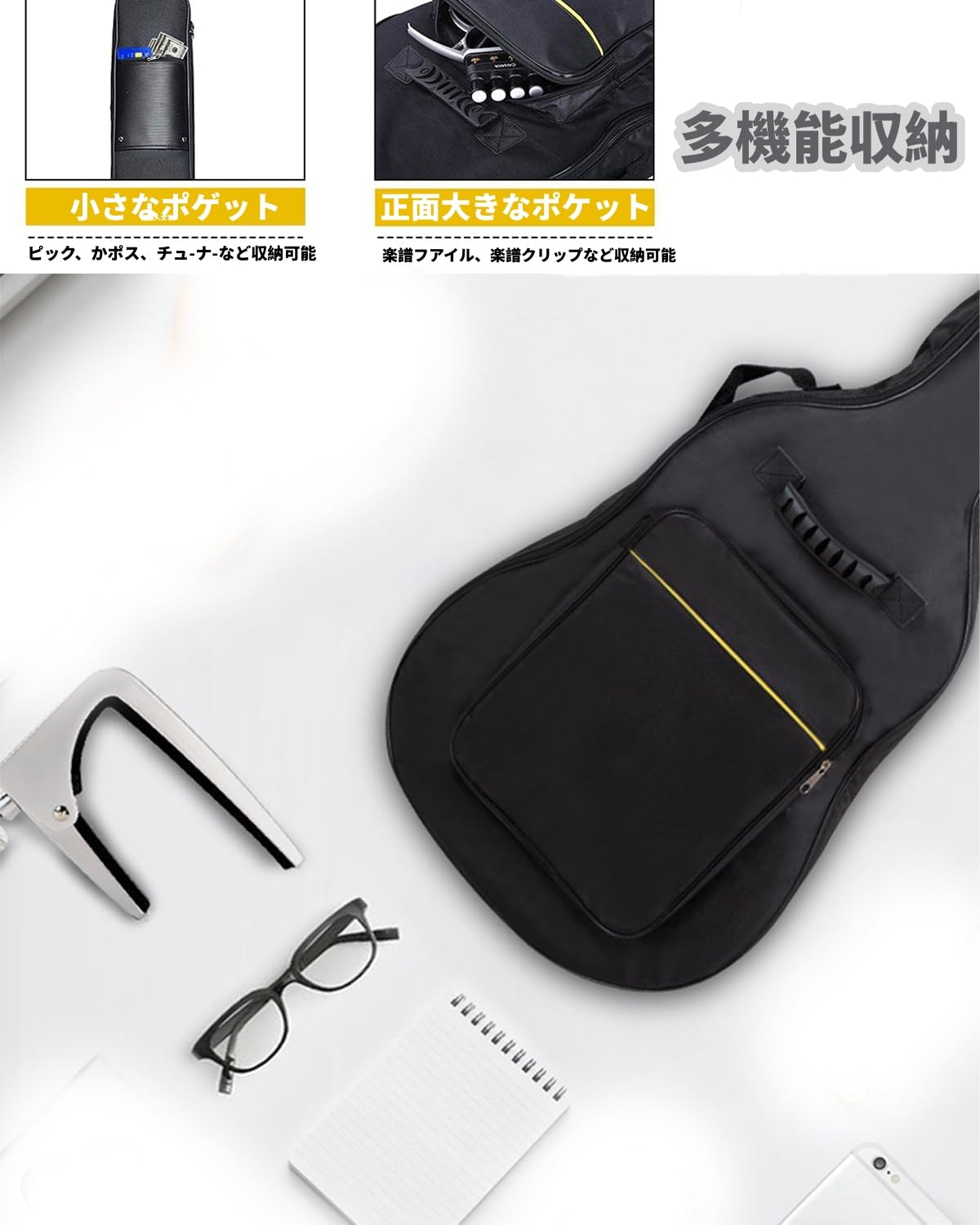 【便利な収納】:ギターバッグの側面とネック部分には小さな収納ポケットがあります。楽譜、ピック、カポ、A4サイズまでを収納可能なメイン・ポケットなどのさまざまなアクセサリーを収納するのに最適で、整理された状態を保ち、必要な時に簡単にアクセスできます。