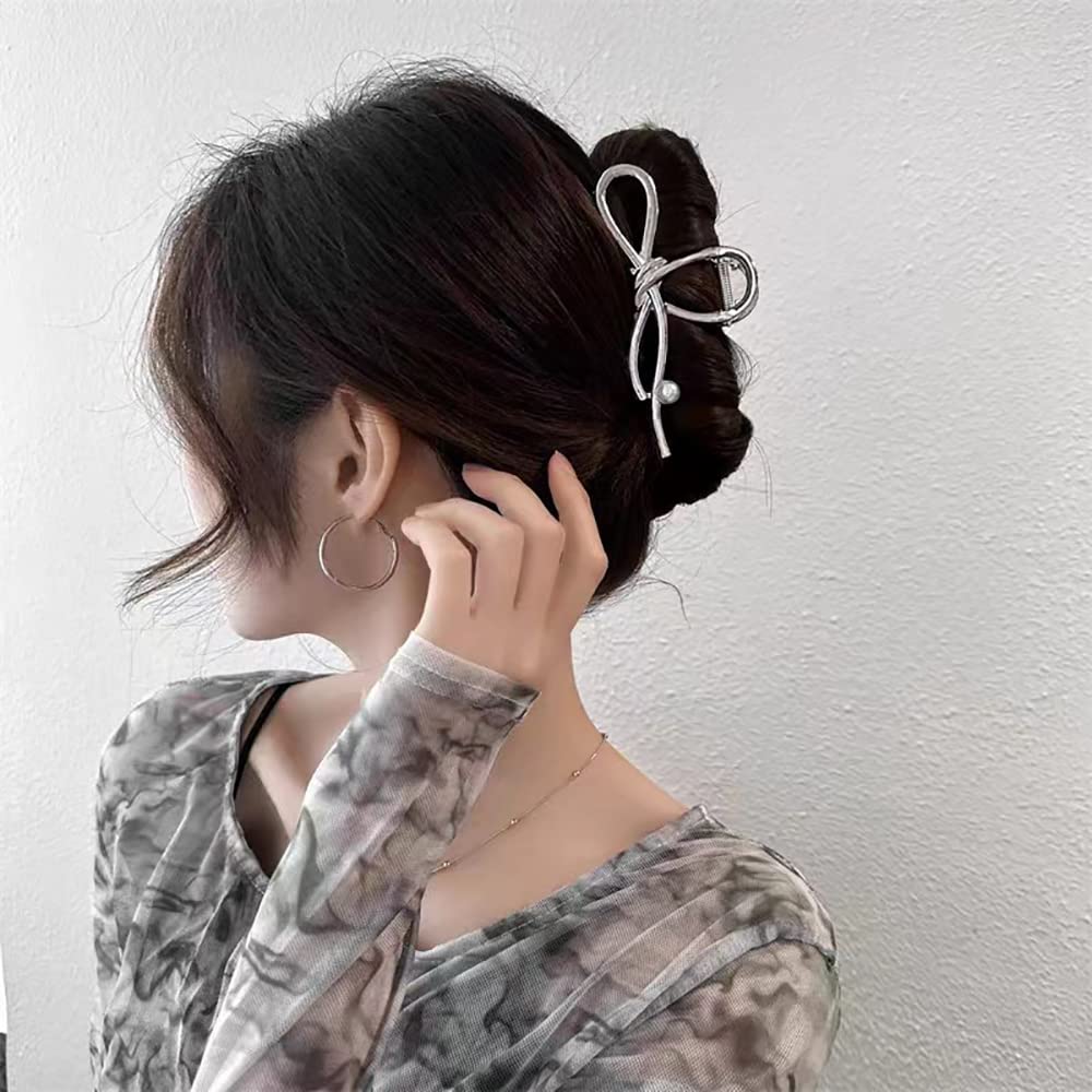 シルバー ヘアクリップ メタル バンスクリップ フレンチパール チップ ヘアアクセサリー シルバーリボン 太い髪用 女性用 エレガントなヘアバレッタ ヘアデコレーション ライン 蝶結び ヘアピン バナナクリップ 1個