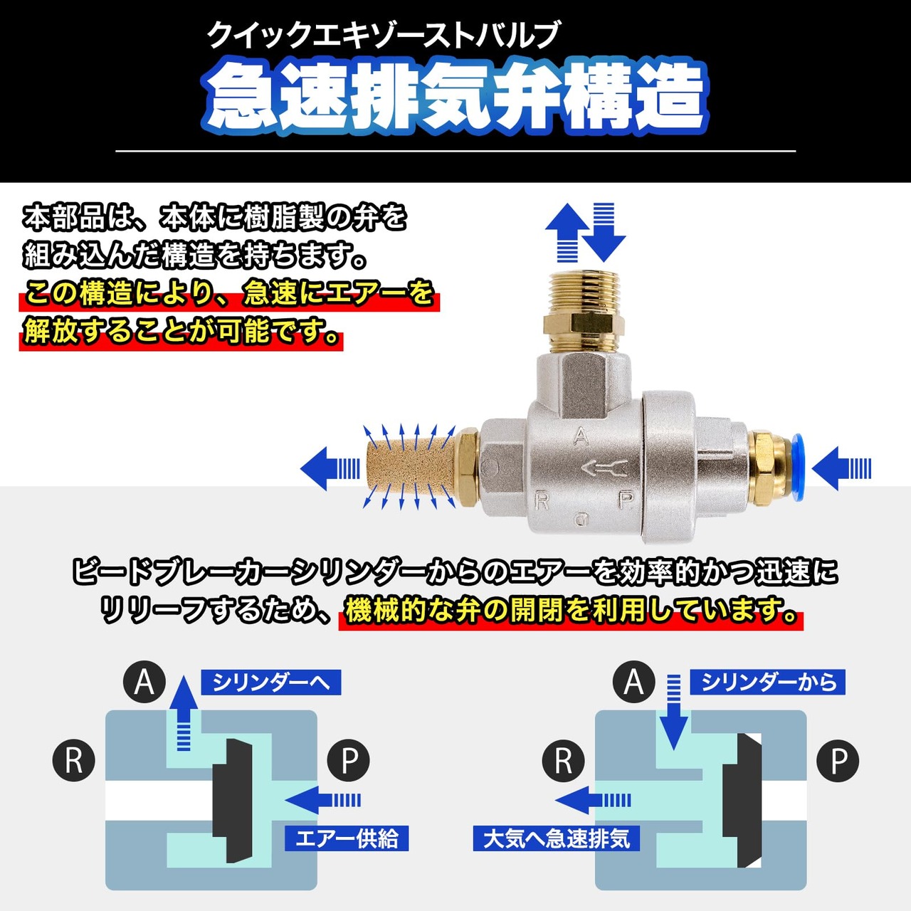 ✅タイヤチェンジャー やビードブレーカーシリンダーのエアーを急速排気するクイックエキゾーストバルブです。<br>✅本部品は、本体に樹脂製の弁を組み込んだ構造を持ちます。この構造により、急速にエアーを解放することが可能です。ビードブレーカシリンダーからのエアーを効率的かつ迅速にリリーフするため、機械的な弁の開閉を利用しています。<br>✅急速排気弁は丈夫な構造を持っていますが、消耗品のため使用する過程で劣化が起こる可能性があります。特に、連続的な作動や高圧のエアーにさらされることで、樹脂製の弁が劣化し、エアー漏れが発生することがあります。定期的な点検やメンテナンスが重要です。<br>✅急速排気弁が不調になると、シリンダーが正常に動作しなくなる可能性があります。例えば、シリンダーが戻らなくなったり、伸びなくなったりすることがあります。そのため、予備部品として急速排気弁を備えておくことが重要です。<br>✅【ねじサイズ】エアー入口G1/8(エアーチューブ径φ6)、エアー出口G1/8、エアー排気口(サイレンサー)G1/8 【使用圧力】0.8MPaまで 【材質】アルミ ※取扱説明書は付属しませんのでご了承ください。