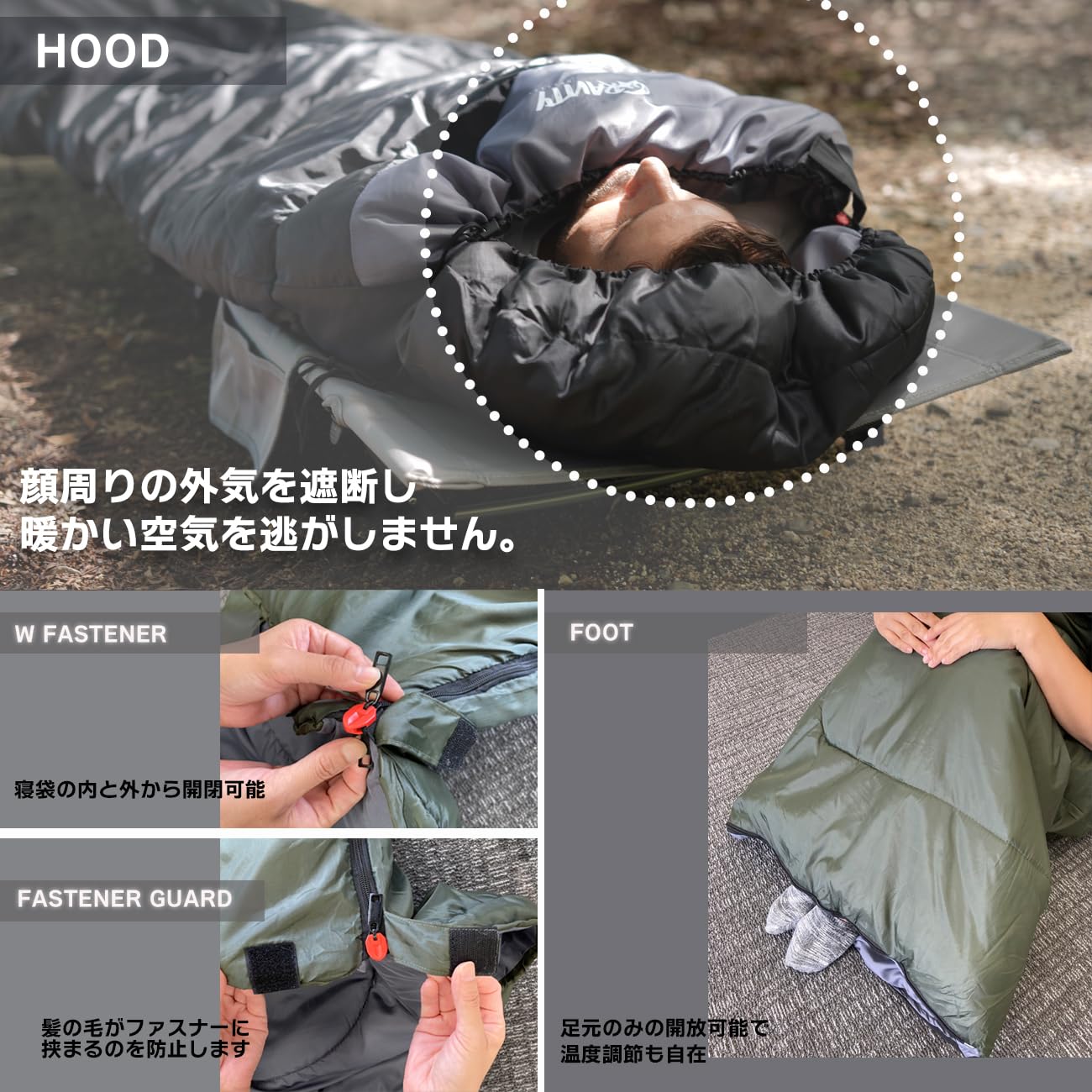 外側生地は210Tと言う平織りが密な生地構造になっているため内側の温もりを外に逃さず暖かい状態をキープしたまま使用できます。