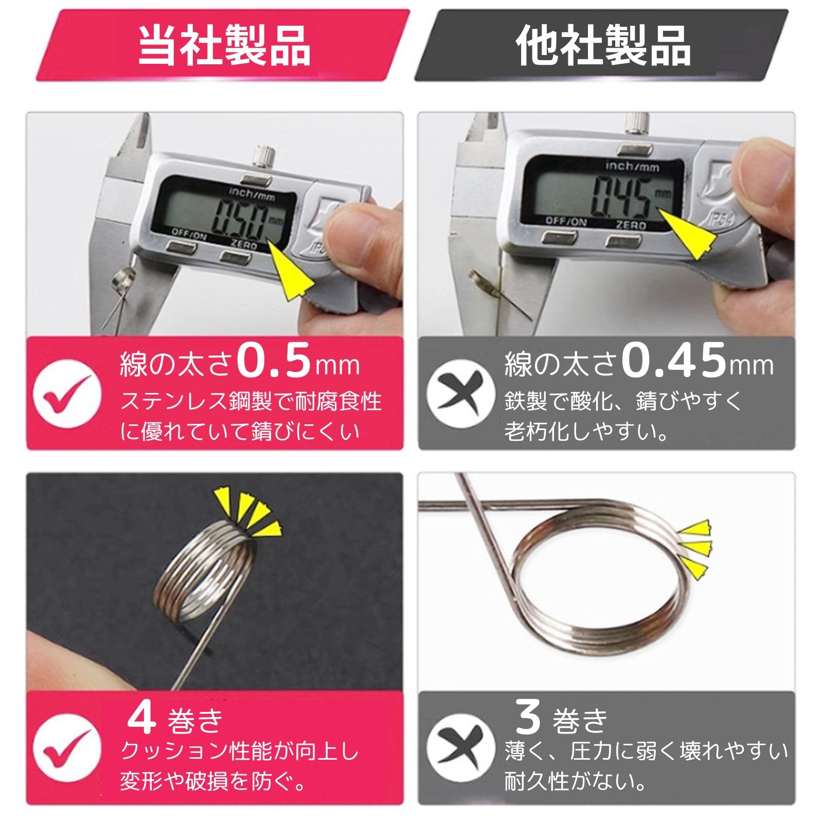 高品質スプリング 他社製品よりも巻き数を増やし、クッション性能を向上。ステンレス鋼製で耐腐食性に優れ、長期間の使用にも錆びにくいです。