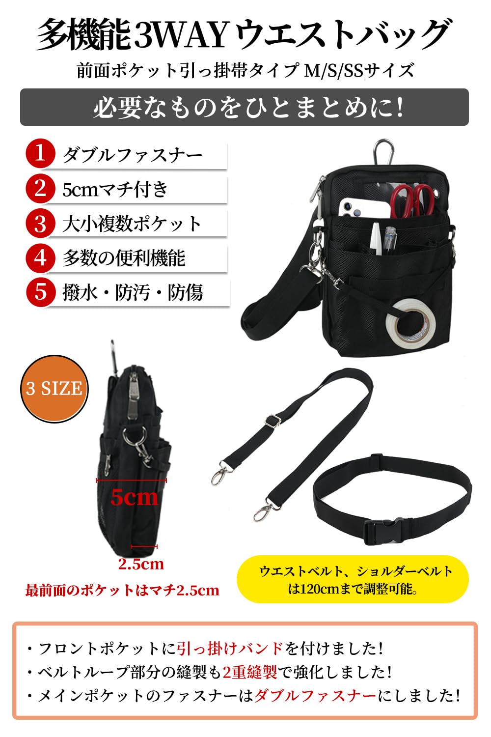 ●マチ5cm大容量、複数ポケットと多数の機能を兼ね備えた仕事用ウエストポーチ!6.8インチスマホも入れられます。 ■【ダブルファスナー・縫製強化仕様 】メインポケットのファスナーをダブルファスナーにし、ベルトループ部分の縫製も2重縫製で強化! ■【大小複数ポケットで仕分け】メモ帳、スマホ、A6・B6ノートなどが入る大きめポケット、貴重品収納に便利な内部ファスナーポケット、ペンやハサミ等が入る細長ポケット、小物収納にぴったりのフロントポケットなど、大小ポケットの組み合わせで使いやすさ抜群!ワークポーチやナースオーガナイザーとしても便利です。 ■【マチ5cm大容量】メインポケットのマチは約2.5cmだからちょっと厚みのあるものも入れられます。また最前面のポケットもマチ2.5cmにし、全体でマチ5cm仕様にしました。■【便利な機能が多数】テープを通せるループ、時計や鍵をつけられるDカンやボタン式ループ、ベルトループに掛けバッグの位置を固定できるカラビナが付属。フロントポケットには引っ掛けバンド付き!■【3WAY仕様】ウエストバッグ用と斜め掛け用の2種類のベルトとカラビナで、お好みのスタイルに使い分け可能。ウエストベルト、ショルダーベルトは共に120cmまで調整可能。 ■【耐久性抜群】生地は、アウトドアバッグ等に使われる1680Dポリエステル(オックスフォード織)を採用。密度が高く耐久性のある素材。強い生地のため型くずれせず、収納物をしっかり守ります。■【表面:撥水・防汚加工 / 裏地:防水加工】バッグ表面は水を弾き汚れが付きにくい撥水仕様。各ポケットの裏地は、PVC加工を施した防水仕様です。(完全防水ではございません)■【防傷素材】カッターでも傷が付きにくい仕様。バッグがボロボロになりにくく、あなたの身だしなみをサポート。 ■【幅広い用途】軽作業やガーデニング、DIY用工具入れとしてだけでなく、接客業や事務職、倉庫業、店員、配達員、美容師、介護士、看護師、家事、育児、掃除など様々なシーンで活躍。6.8インチ大画面スマホも入るので、スマホポーチ、ガジェットポーチとしても使えます。■【男女兼用デザイン】シンプルながら、独特のうねりによる光沢感があり上品な雰囲気も感じられます。年齢を問わず、男性にも女性にもおすすめ。 ■【商品詳細】商品内容:ウエストバッグ、ショルダーストラップ、ウエストベルト、テープループ、カラビナ サイズ: M高さ24×幅18×奥行5cm, S高さ22×幅16×奥行5cm, SS高さ19×幅14×奥行5cm (※奥行はメインポケット2.5cm+フロントポケット2.5cm) 重量:本体 M 235g, S 210g, SS 185g ショルダーストラップ 50g ウエストベルト 40g 素材:1680Dポリエステル(オックスフォード織) ■【30日間保証】30日間のメーカー保証をお付けしております。万一不具合等ございましたら、新品と交換、返金対応致します。