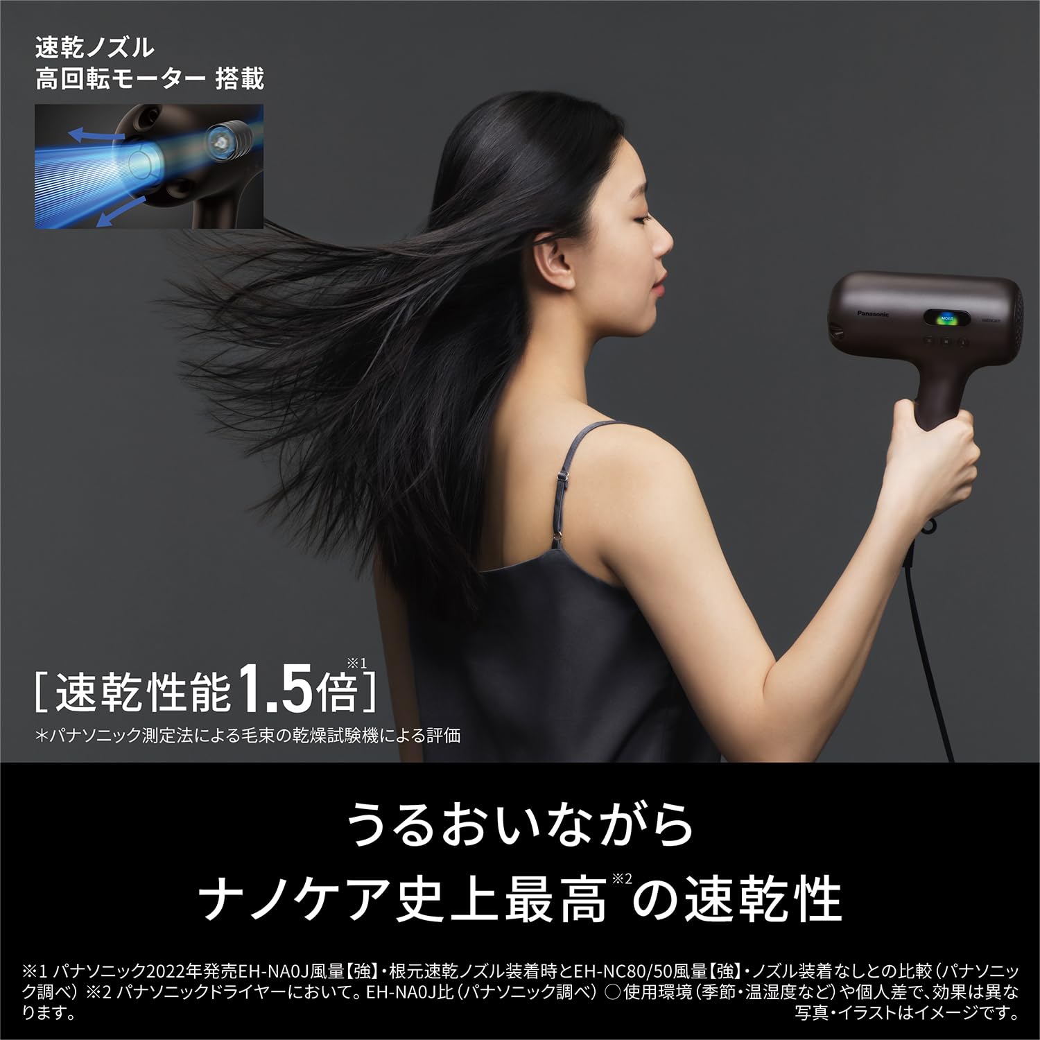 髪へのうるおいは1.2倍※(毛髪水分増加量・当社高浸透ナノイー搭載商品比。2022年発売EH-NA0Jとの比較・当社調べ)