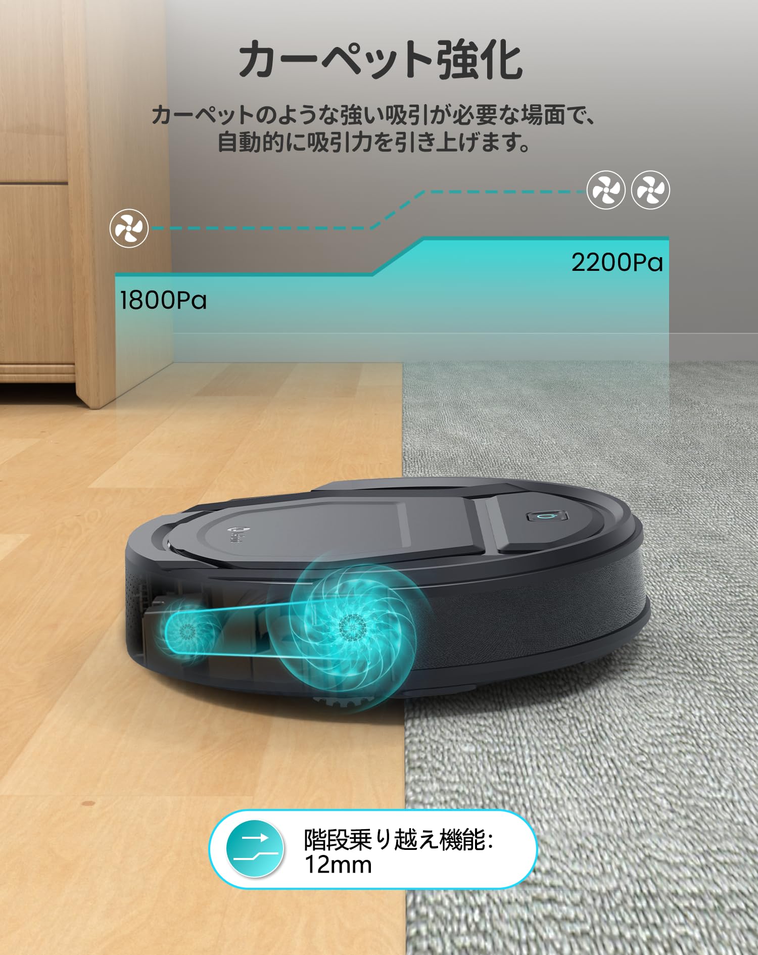 強力な吸引力で、髪の毛やペットの毛をしっかりと吸い込めます。ロボット掃除機はブラシレス吸引口設計です。ブラシレス吸引口なので絡みともつれを防ぎ、清掃の手間が省ける。