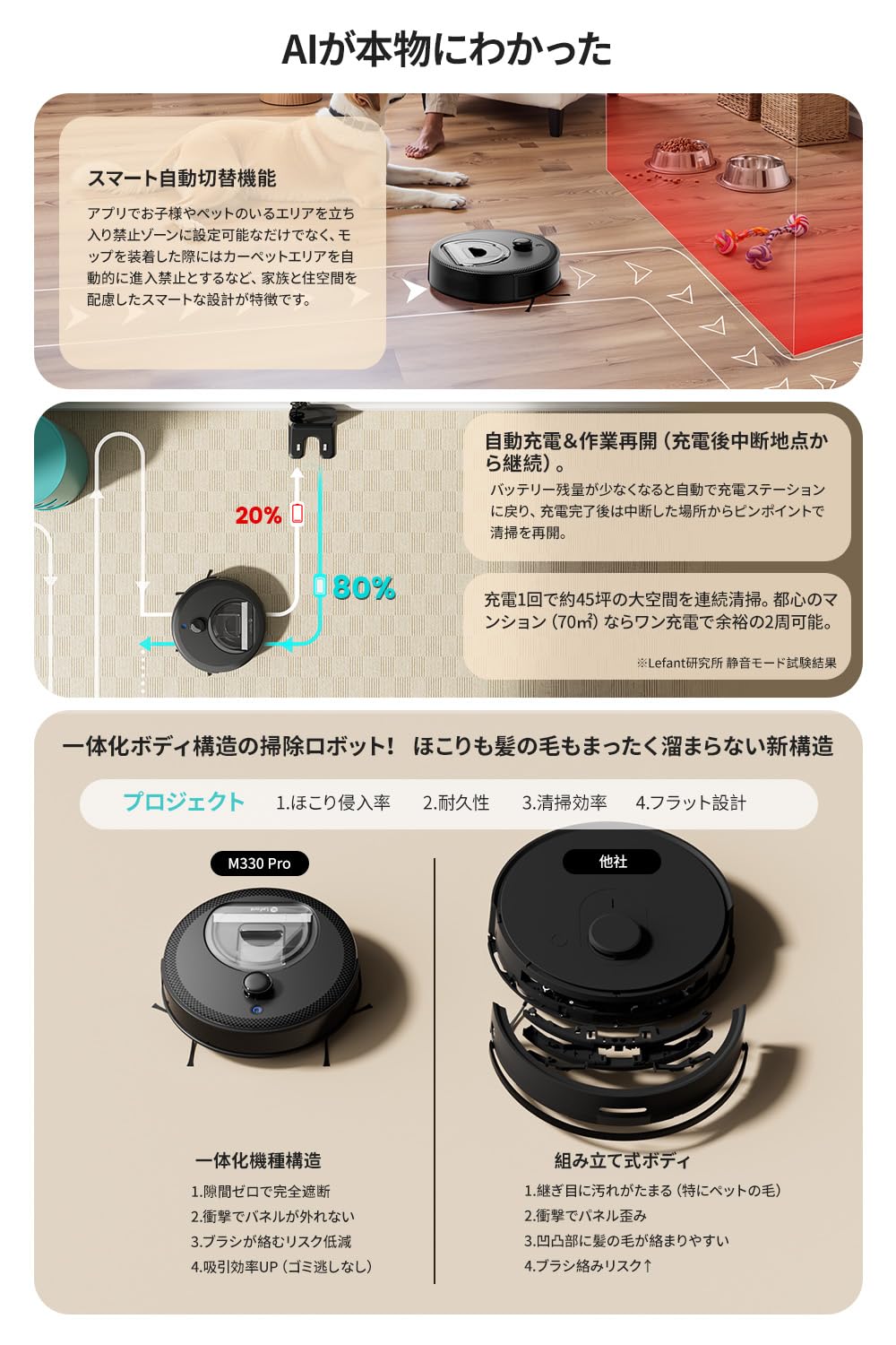 Lefant M330 Pro ロボット掃除機【水拭き両用 3Dマッピング 6000Pa強力吸引 静音設計 150分间の連続掃除 取り外し可能モップ エリア指定可 自動充電 アプリ連動 可視化ダストボックス カーペット対応 Alexa対応】ブラック